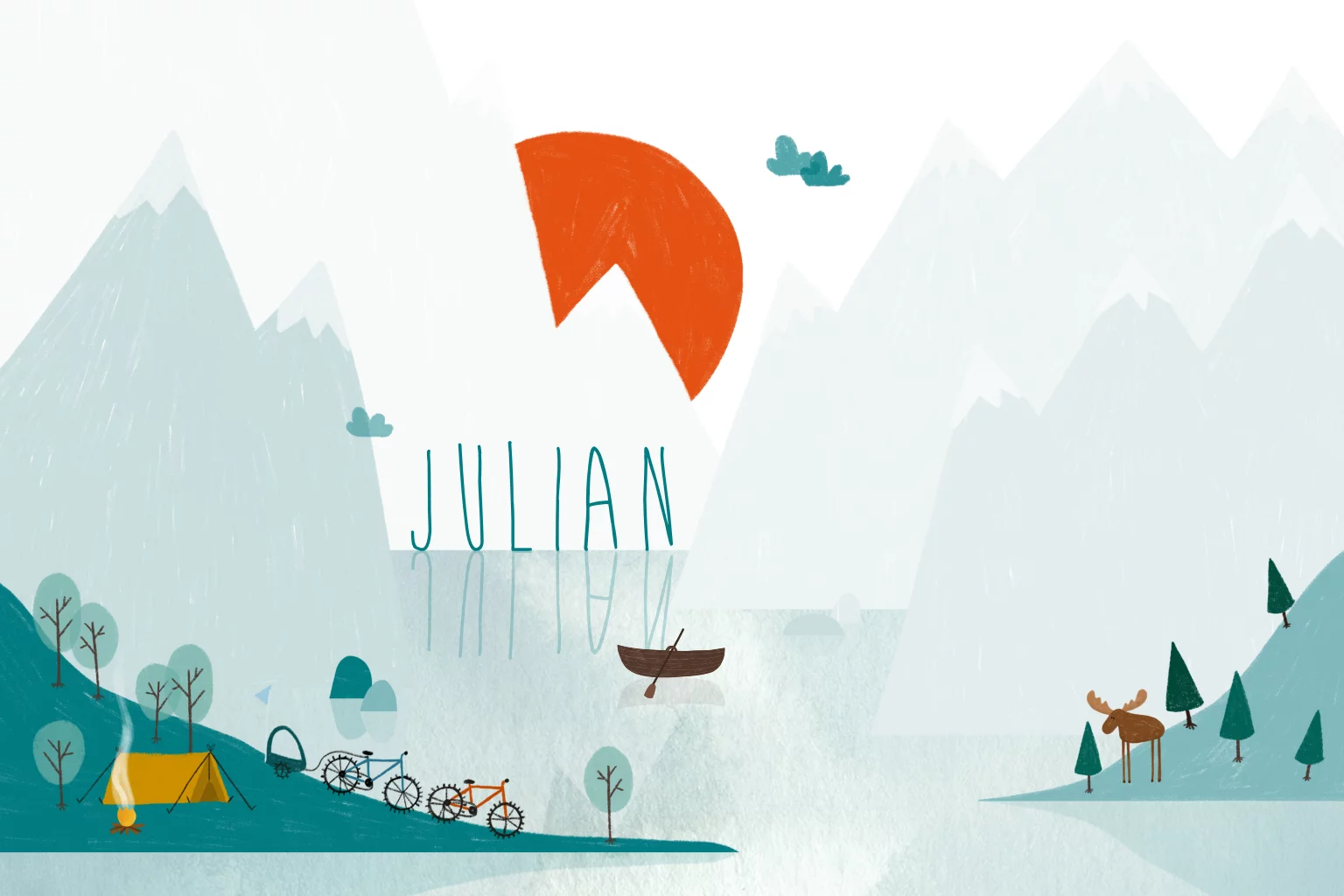 Geboortekaartje voor een jongen met avontuurlijke bergen, een meer van waterverf en je kunt zelf alle elementjes aanpassen. Zo kun je wat betreft kamperen ook een campertje er van maken of in plaats van een eland een hertje neerzetten.