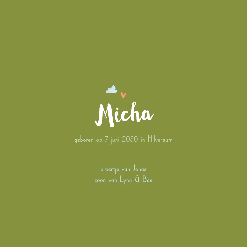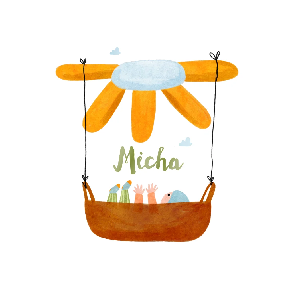 Een zomerse lieve unieke geboortekaart met een illustratie van baby die hangt in een mandje aan een vrolijke bloem met warme frisse kleuren. De naam en de wolkjes staan in hoogglans, dat kun je zelf nog naar wens aanpassen.