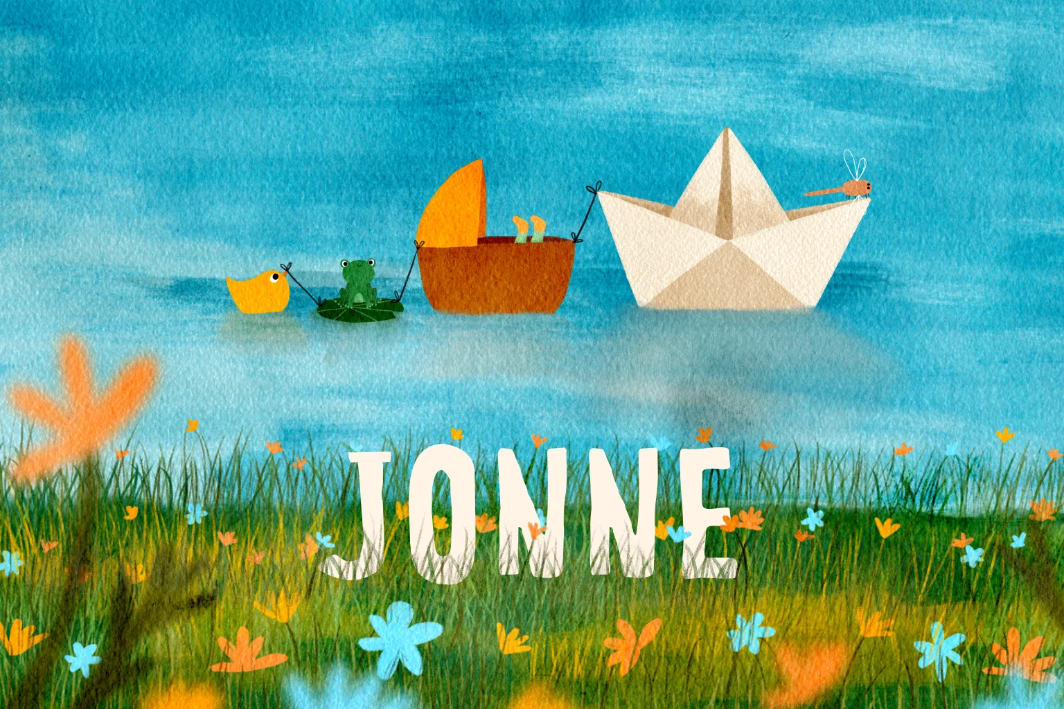 Een lief vrolijk geboortekaartje, net een schilderijtje! Een papieren bootje met een wiegje en schattige diertjes. De naam staat leuk tussen de bloemetjes en gaat helemaal op in de illustratie. Heb je ergens hulp bij nodig? Mail even!