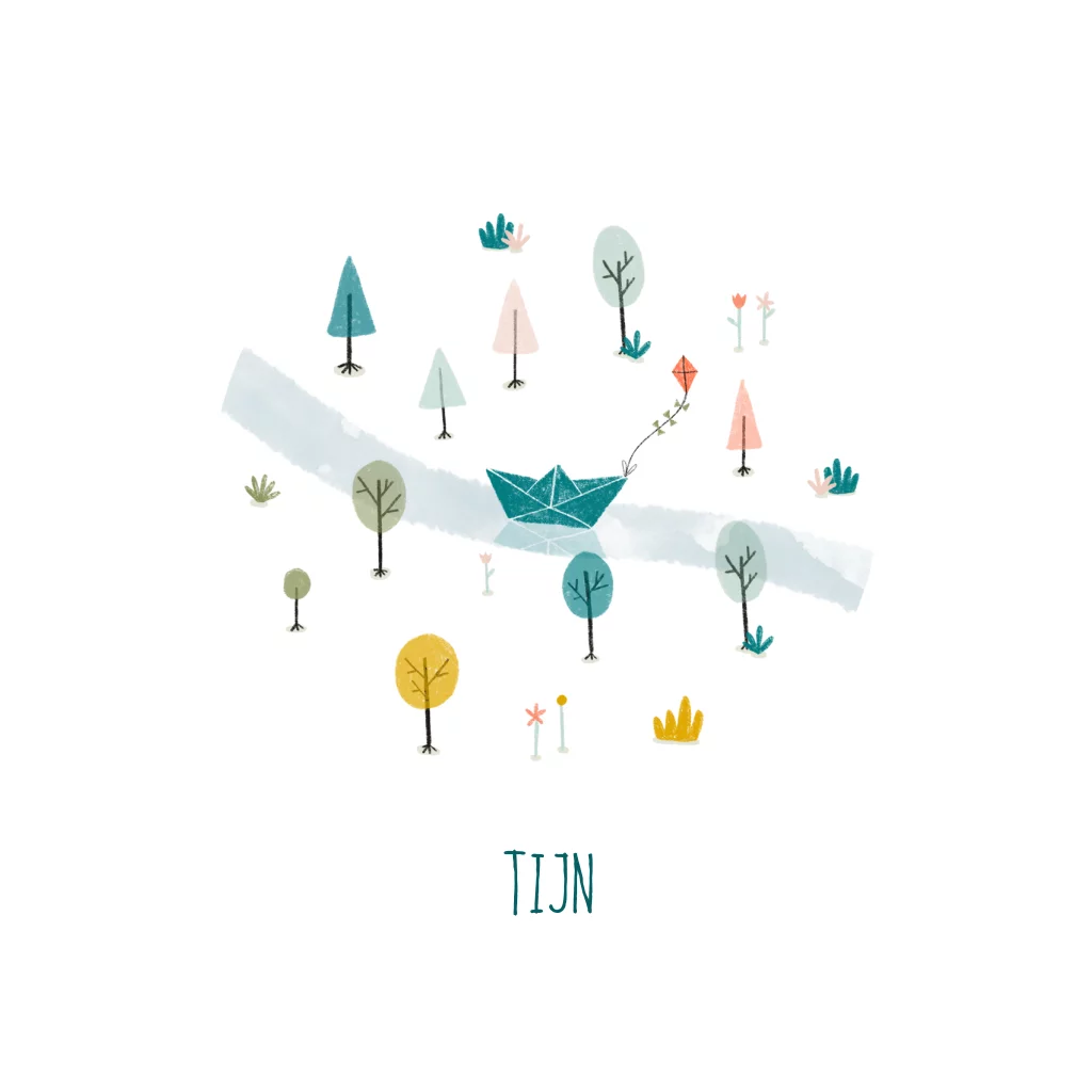 Een rustig vrolijk geboortekaartje met boompjes in verschillende kleuren en een bootje met een vliegertje. Klaar om op avontuur te gaan!