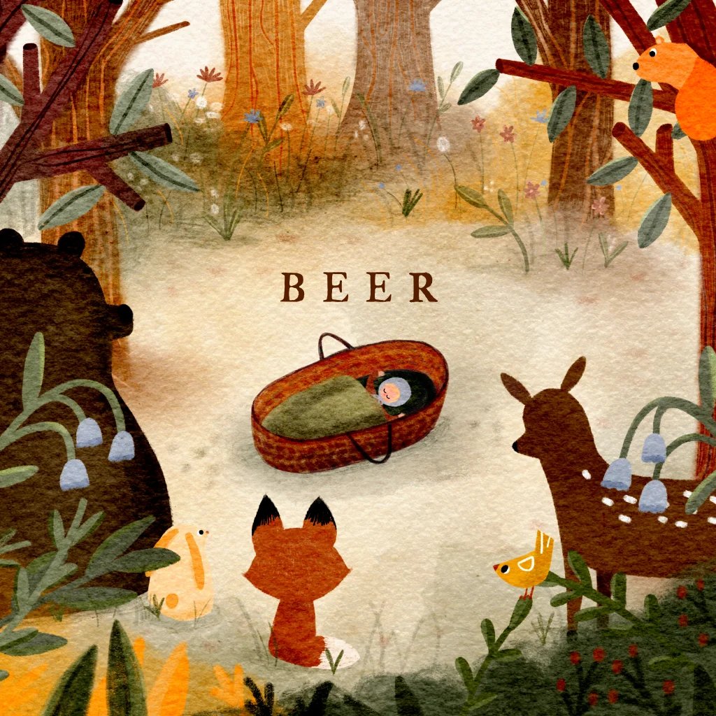 Een prachtig geïllustreerd geboortekaartje met een illustratie van bosdieren zoals een hert, vos, konijn en beer, die op een open plek in het bos kijken naar een lief kindje in een mozesmandje.