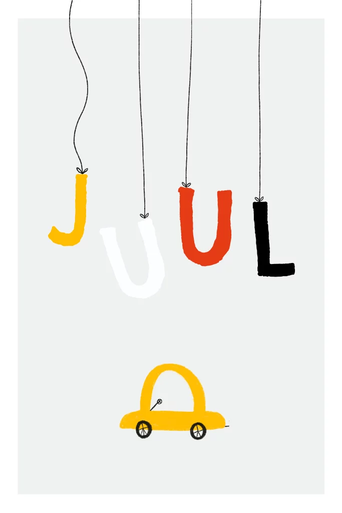 Een lief minimalistisch geboortekaartje met vrolijke letters aan touwtjes en een autootje.