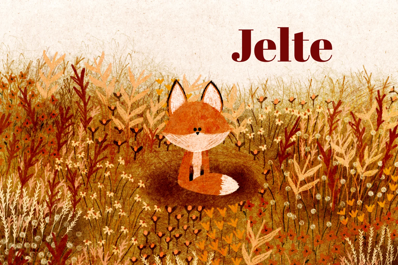 Een geboortekaartje met een illustratie van vosje zittend in een bomvolle bloemenweide, in mooie warme nazomer/herfst kleuren.