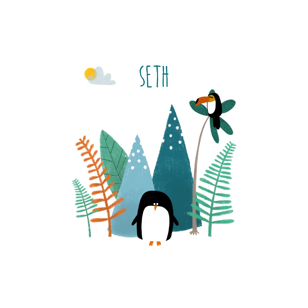 Een tropisch geboortekaartje met illustratie van bergen en jungle, pinguin en toekan.