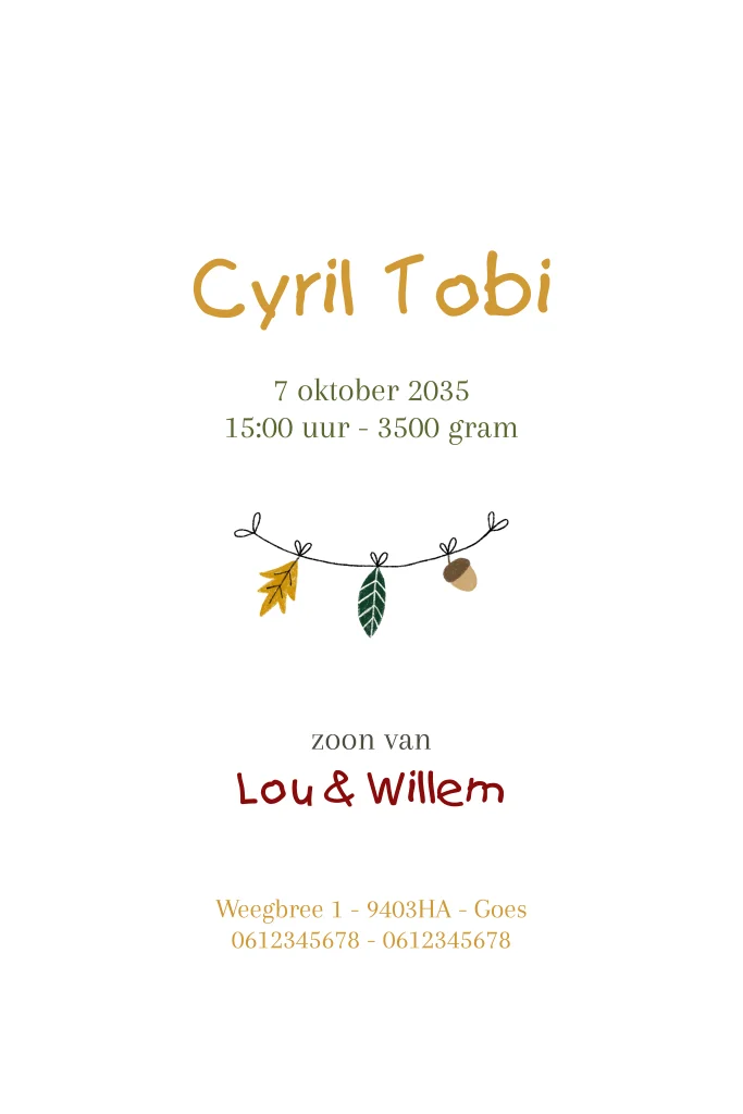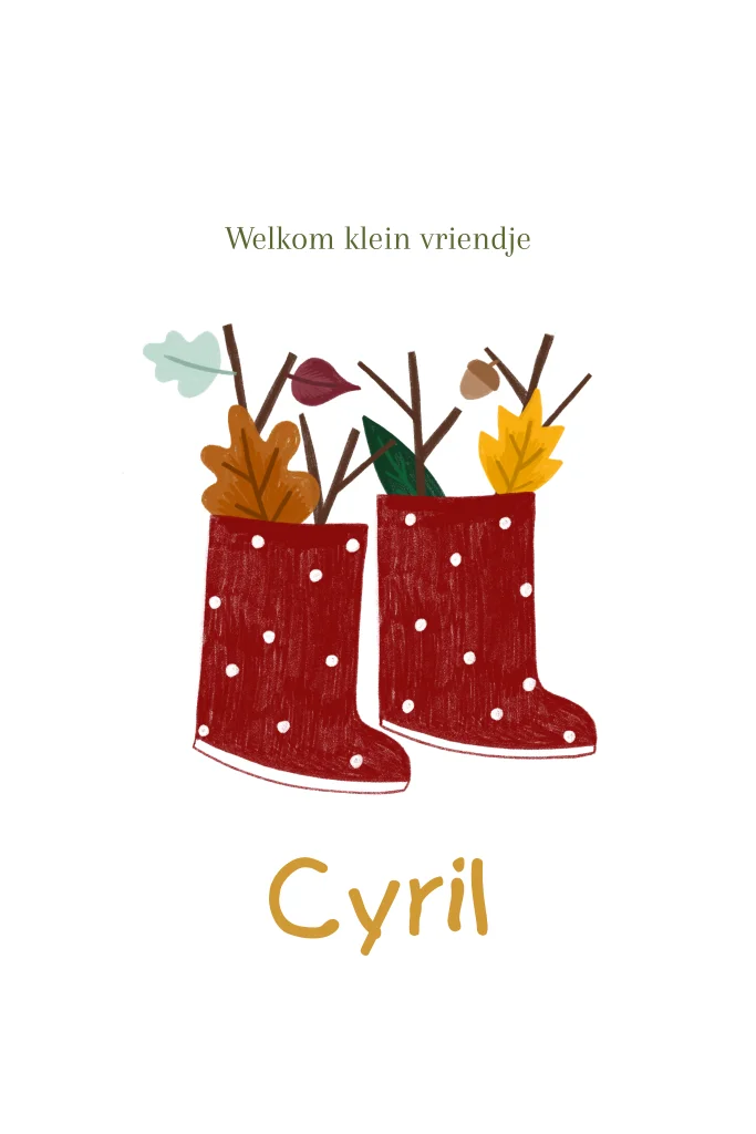 Een vrolijk geboortekaartje voor in de herfst, met vrolijke herfstblaadjes en stokken, verzameld in laarsjes. Kies zelf de kleur uit van de laarsjes.