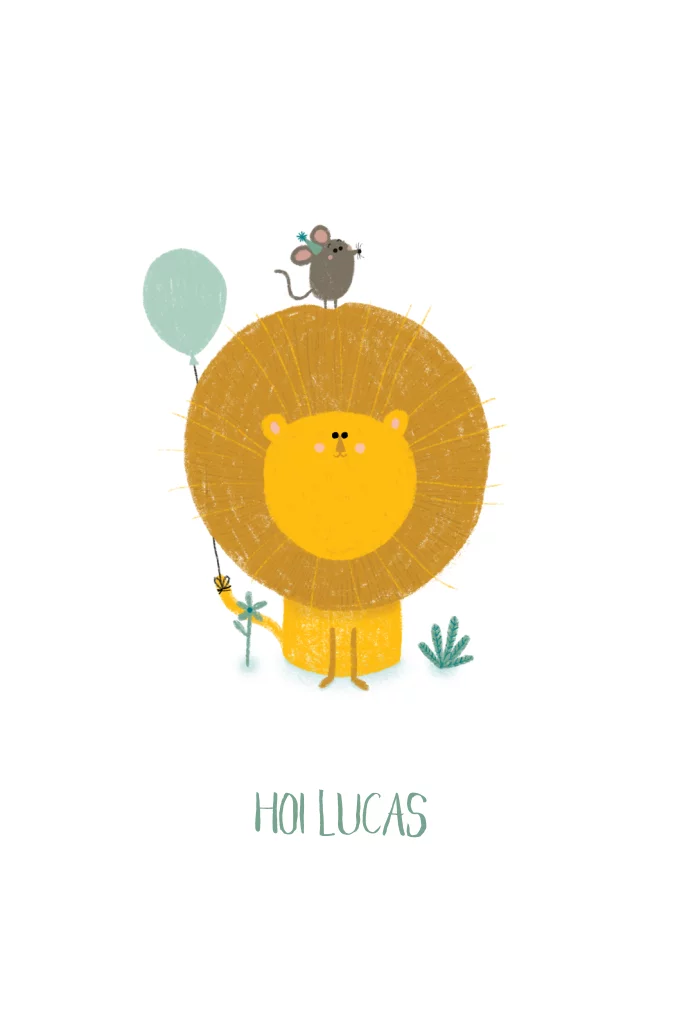 Een feestelijk geboortekaartje met een vrolijke gele leeuw en een muisje verstopt.
