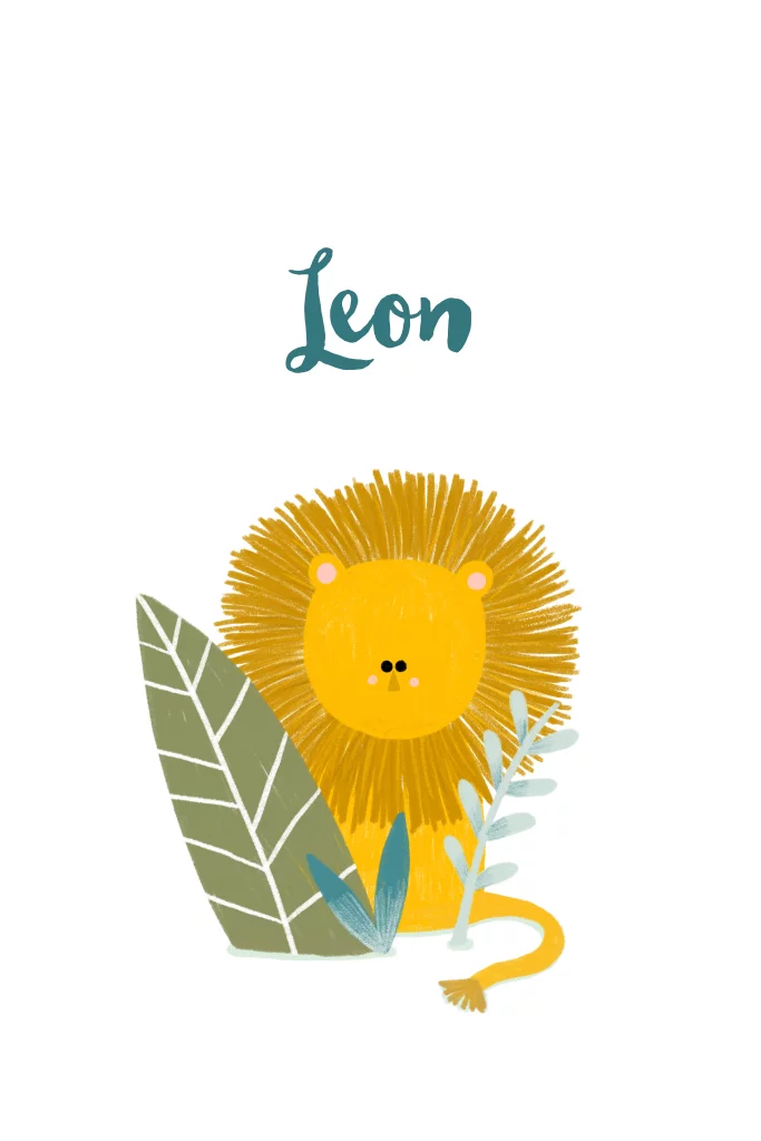 Een lief rustig geboortekaartje met een schattig leeuwtje en tropische plantjes.