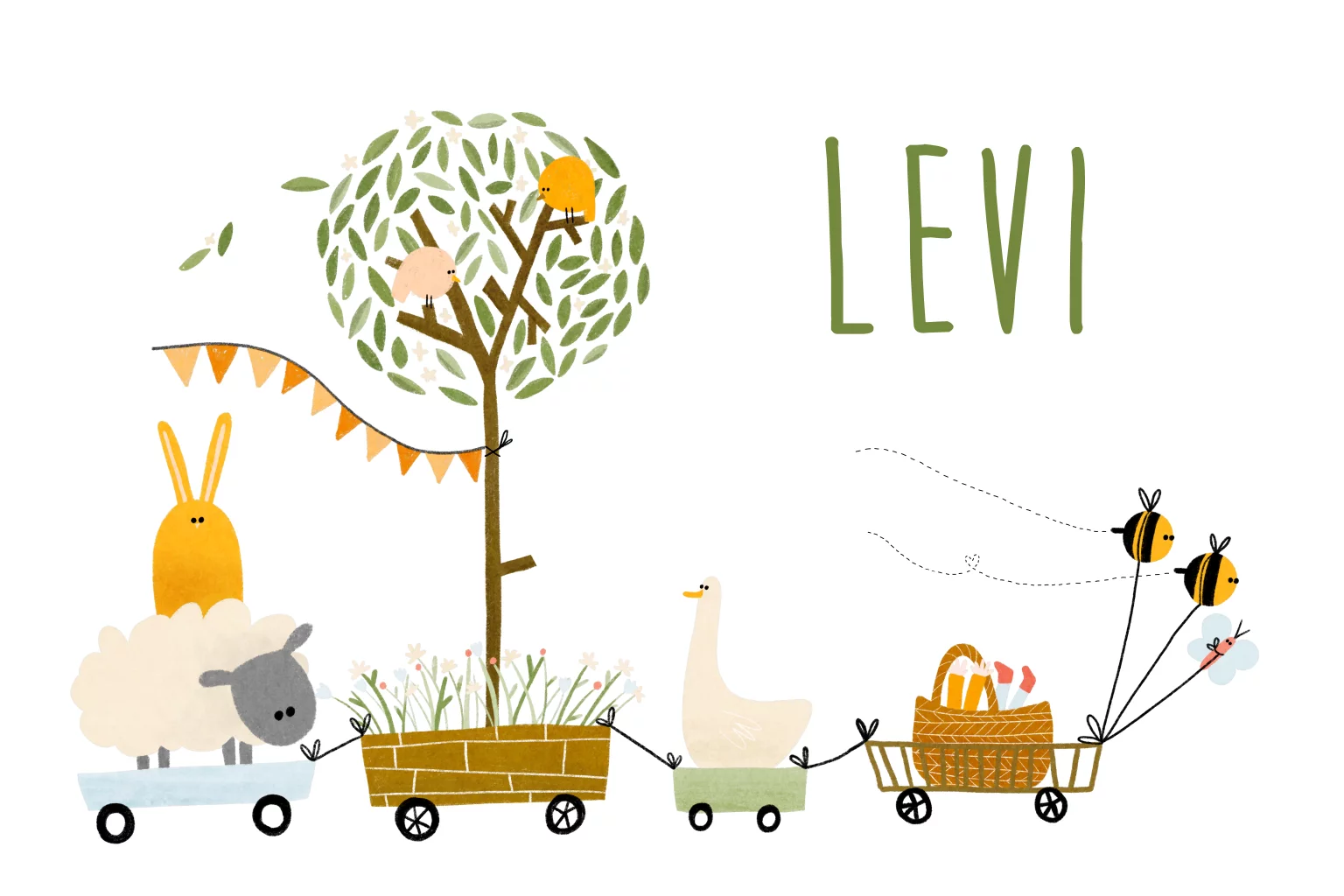 Een vrolijk geboortekaartje met een treintje met verschillende lente diertjes, zoals een schaap, konijn en gans, in zachte vrolijke kleuren.