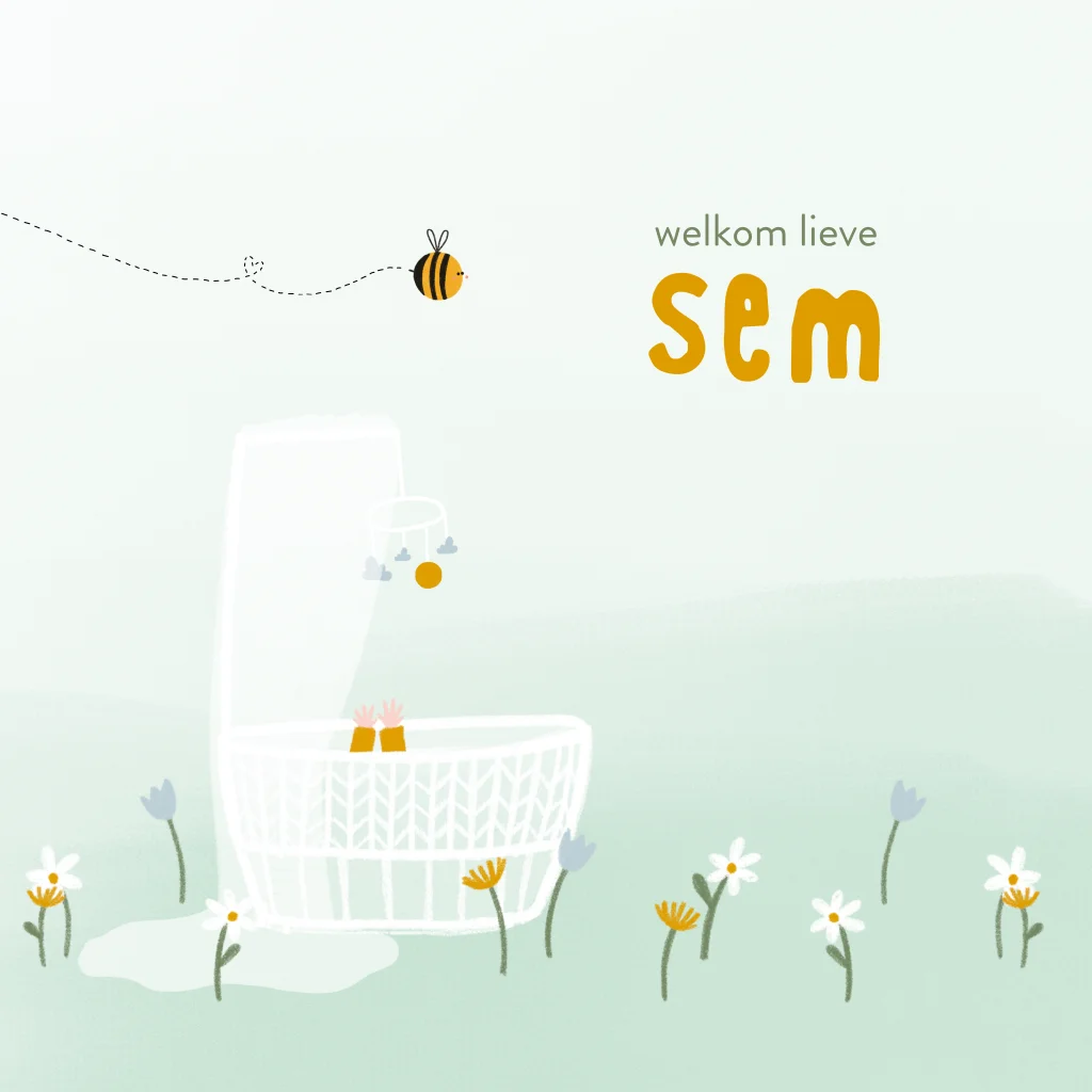 Een vrolijke lief geboortekaartje in zachte kleurtjes, met een wiegje en bloemetjes op het gras. Leuk voor jongens en meisjes!