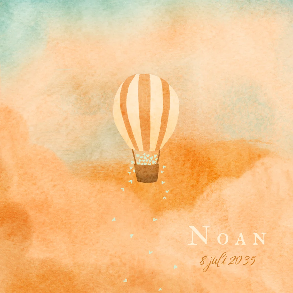 Een prachtig dromerig geïllustreerd geboortekaartje met een illustratie van een prachtige waterverf lucht vol kleuren, waar een luchtballon rondzweeft waar kleine hartjes uit vallen. Perfect voor een lief jongetje!