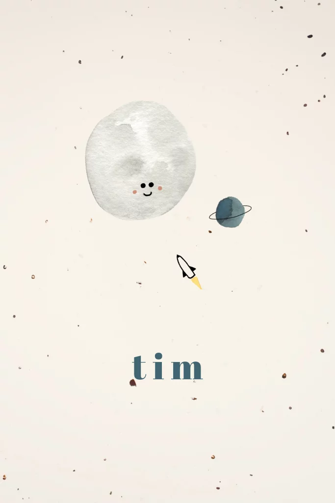 Een lief geboortekaartje met een maan en een raketje. Dit kaartje is heel erg geschikt voor het drukken op duurzaam papier, omdat er weinig inkt gebruikt wordt en contrasterende donkere kleuren. De achtergrond is een voorbeeld, bestel een proefdruk zodat je duidelijk kunt zien hoe de het kaartje gaat worden! Let op: er kan geen wit gedrukt worden op duurzaam papier.