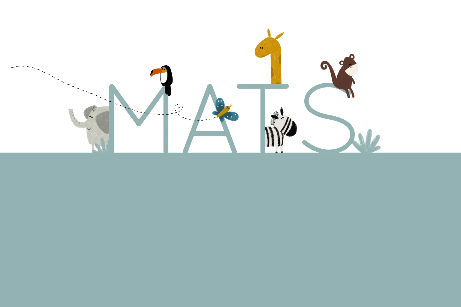 Een minimalistisch geboortekaartje waarbij de naam onderdeel is van de illustratie met jungle dieren.