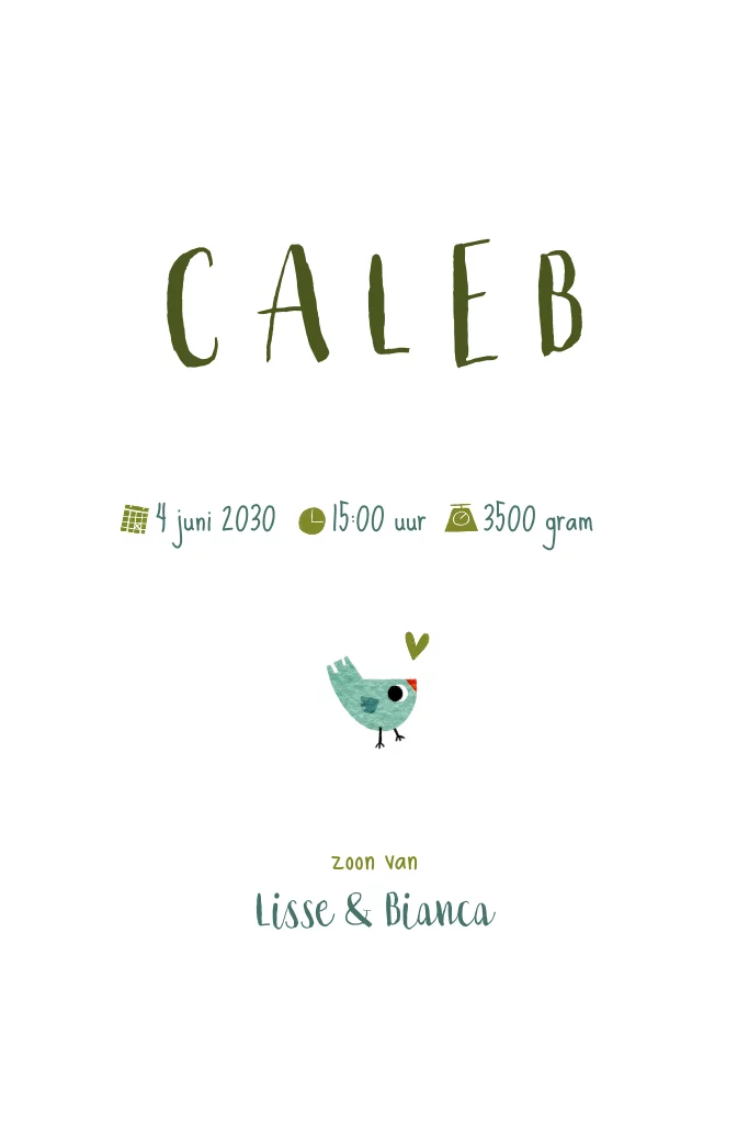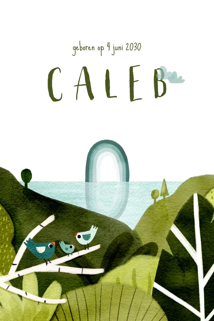 Een origineel geboortekaartje met een illustratie van een landschap vol met groene bomen, uitkijkend op de zee met een mooie blauwe regenboog. Op een tak zit een vogel gezin.