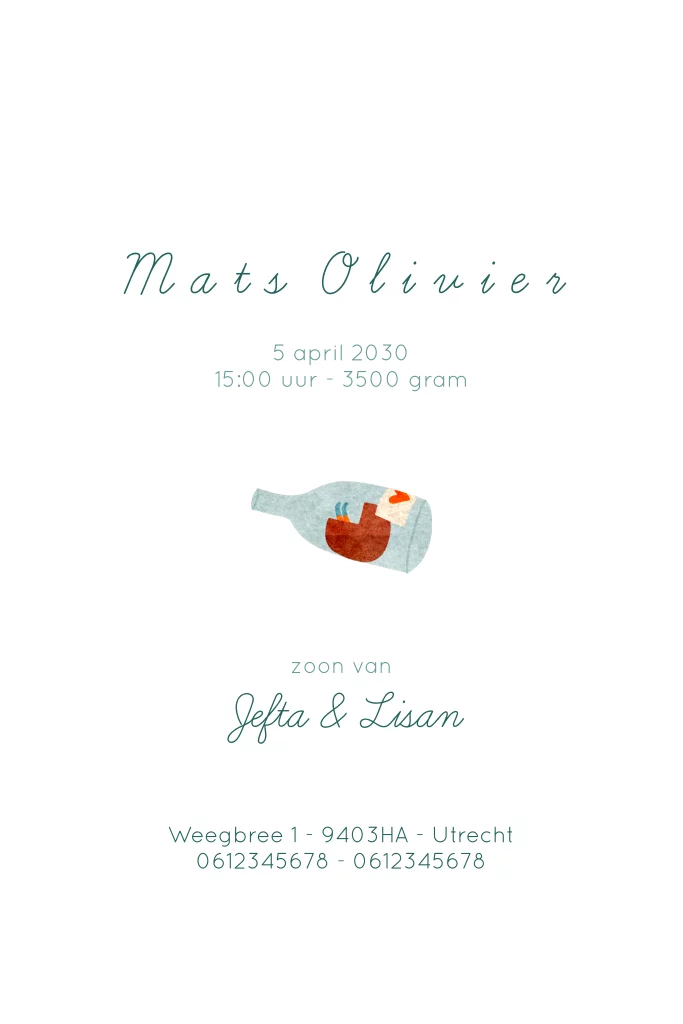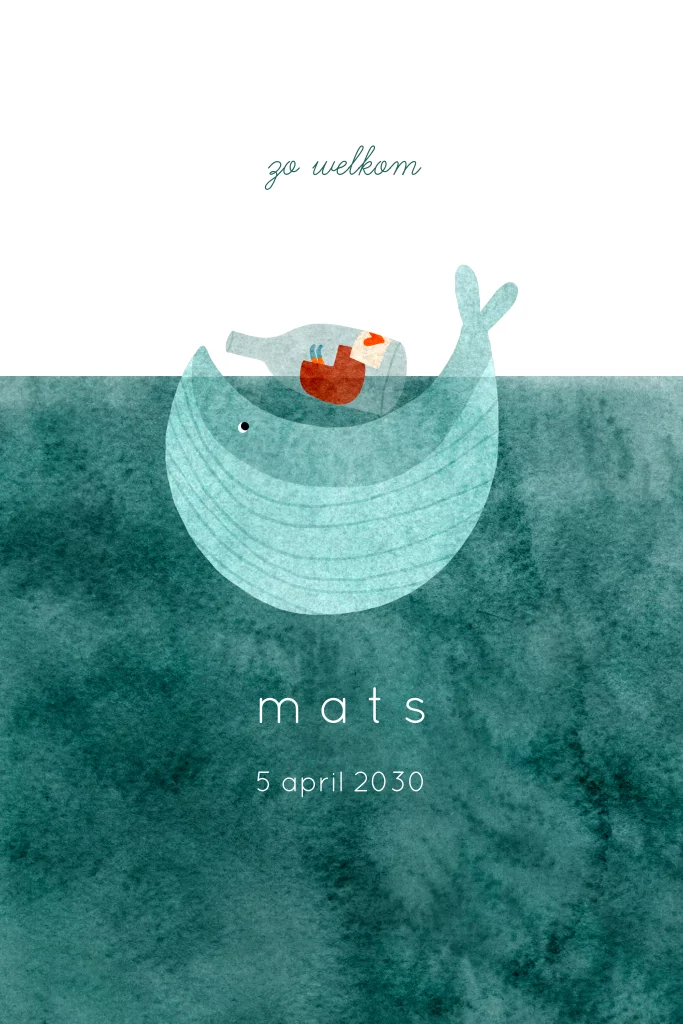 Een origineel geboortekaartje met een walvis die zwemt in de zee en een flessenpost heeft gevangen met een lief wiegje erin.