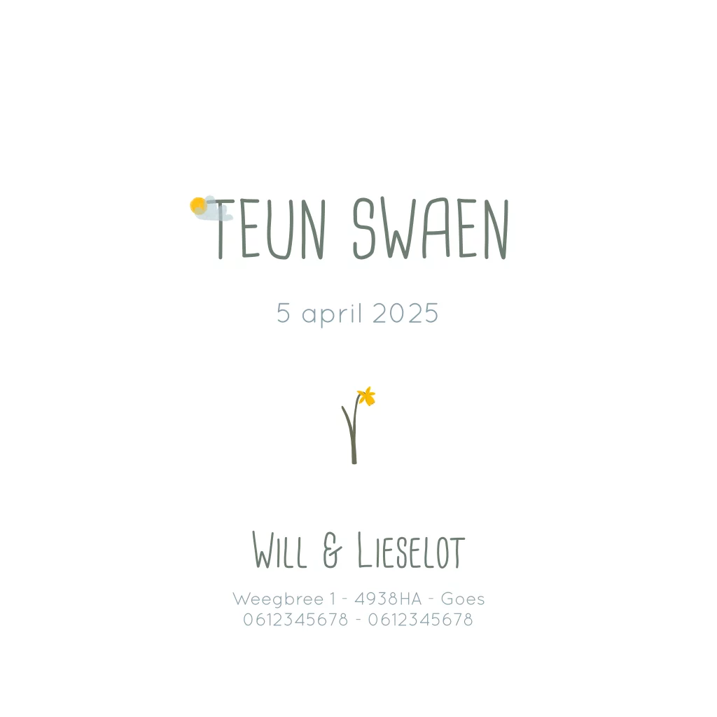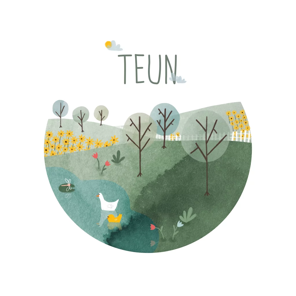 Een vrolijk en lief geboortekaartje met een landschapje van waterverf, met vrolijke bomen en een vijver met eend en gans. Vul het kaartje naar wens aan met bloemetjes en diertjes!