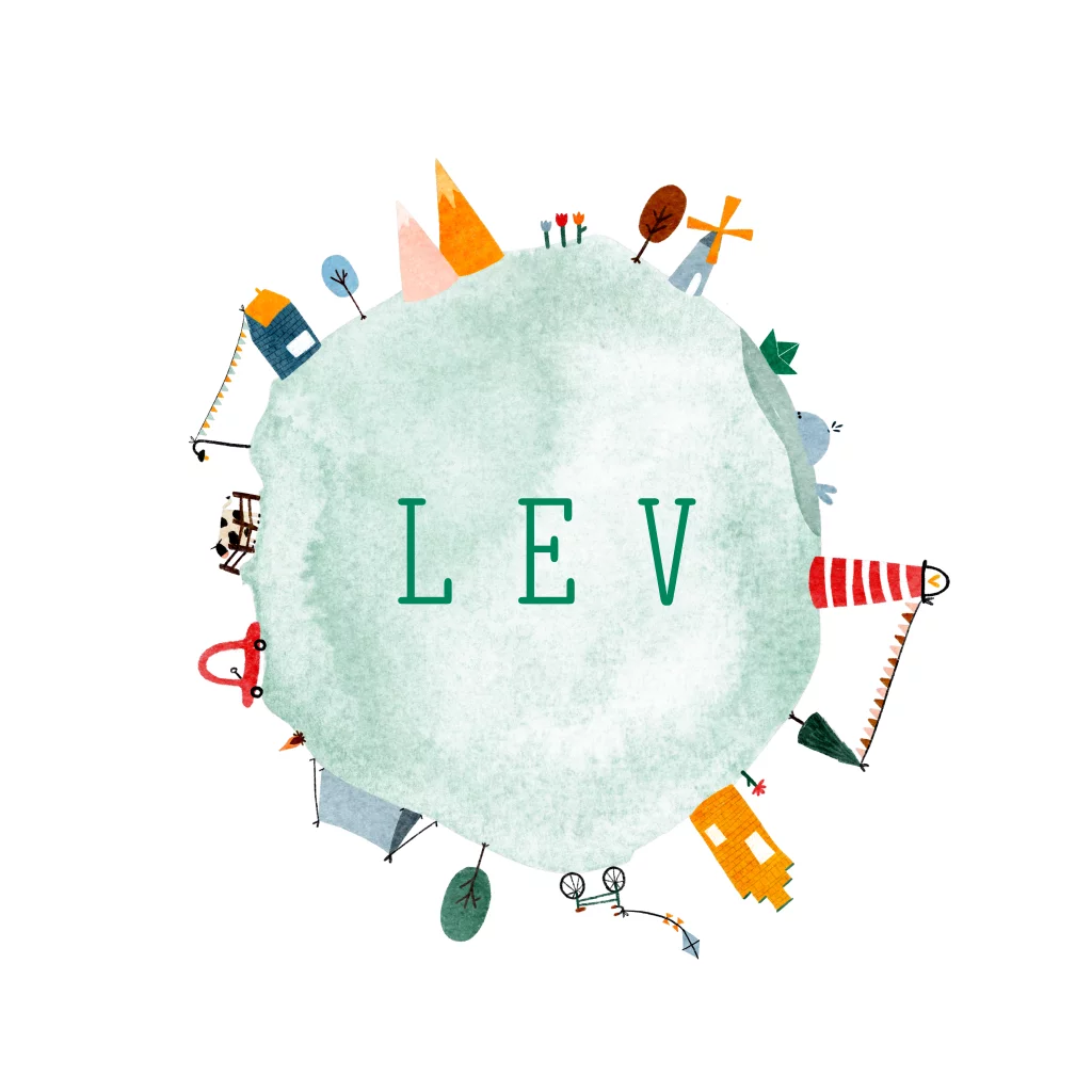 Een lief rustig en supervrolijk geboortekaartje met allerlei Hollandse icoontjes op een waterverf rondje.