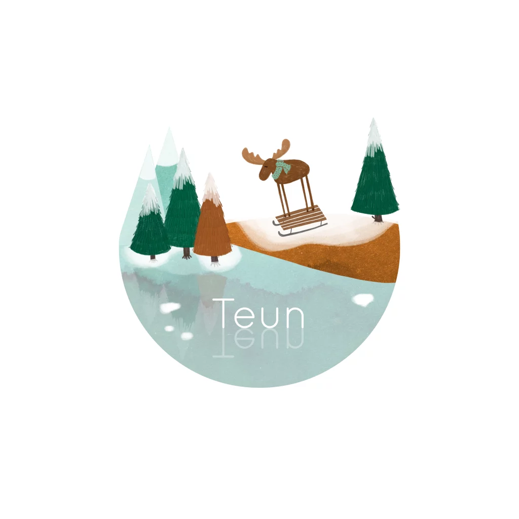 Een geboortekaartje met een winters landschap van waterverf, met sneeuw en een slee met een eland, waar je zelf ook een ander diertje of wiegje naar keuze op kunt zetten.