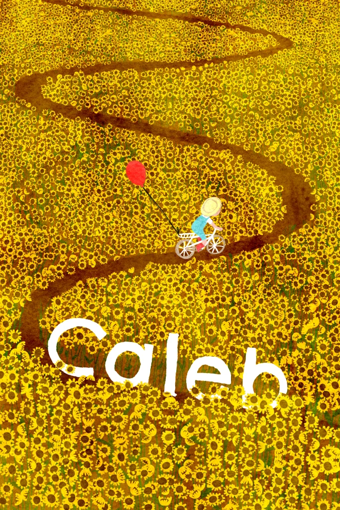 Een geboortekaartje met een illustratie als een schilderijtje. Een veld vol met zonnebloemen, en een lief jongetje op een fietsje met een zonnehoedje. Samen met zijn ballon fietst hij onderweg naar avontuur!