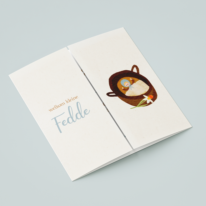 Een lief rustig geboortekaartje in leuke tweeluik 'theatervouw' vorm. Het kaartje heeft een schattige illustratie van een jongetje in een mozesmandje. Er ligt een narcis bij het wiegje om te laten zien dat dit kaartje voor een voorjaarskindje is. Aan de binnenkant is ruimte voor een mooi gedichtje bijvoorbeeld. Pas het kaartje helemaal naar wens aan. Iets aangepast zien aan het kindje? Mail even!