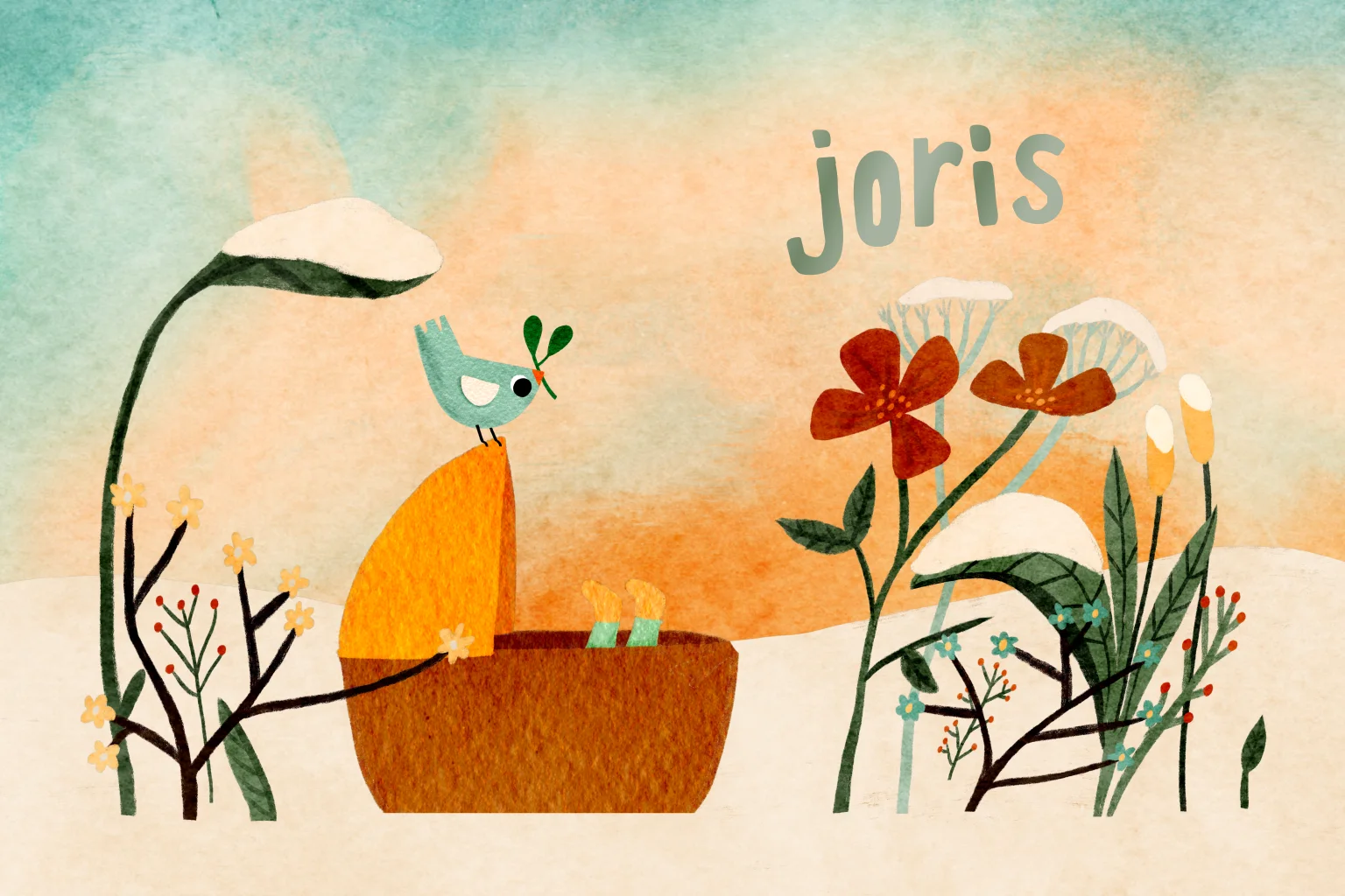 Dit geboortekaartje combineert een warm kleurenpalet met frisse winterse elementen.