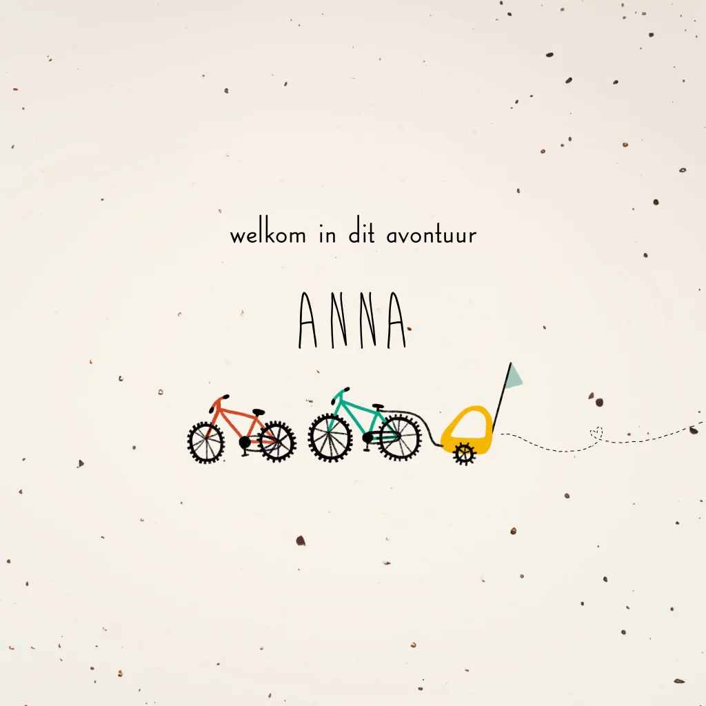 Een lief rustig minimalistisch geboortekaartje. Met twee fietsen en een fietskar, klaar voor avontuur. Op de achterkant een tentje met een gezin.