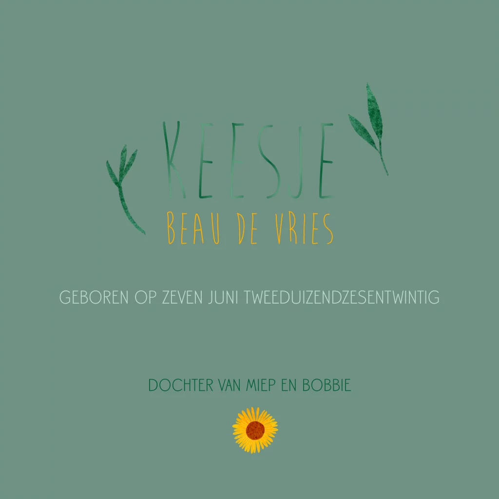Een zomers lief geboortekaartje met een illustratie van zonnebloemen in een krans. Maak de krans helemaal zelf naar wens. De kaart is extra bijzonder door de hoogglans details (plantjes en sommige teksten). Deze kun je uiteraard ook zelf naar kleur aanpassen. Hulp nodig? Laat het ons even weten!
