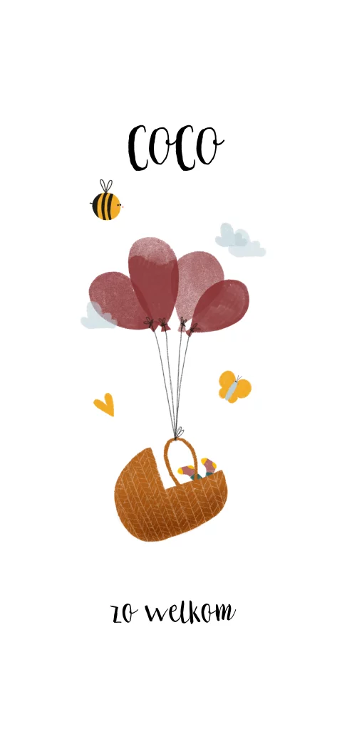 Een hip geboortekaartje met een lief mandje, gedragen door ballonnen.