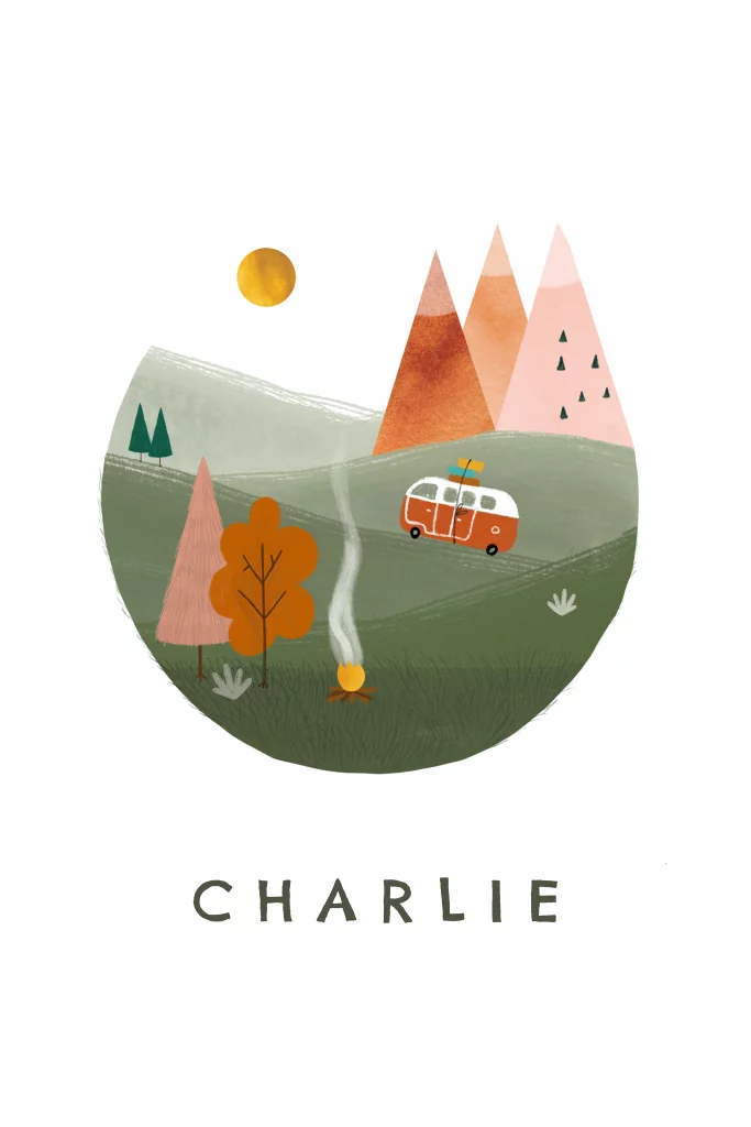 Een mooi rustig geboortekaartje met een cirkel met landschapje, waar een volkswagen busje doorheen rijdt.