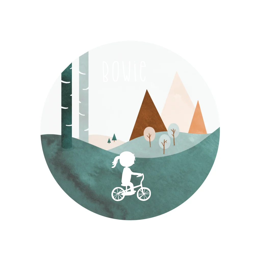 Een lief geboortekaartje met berkenbomen en bergen, en een silhouette meisje op een fietsje in rosegoudfolie. Je kunt ook een jongetje op fietsje uitkiezen, kijk even bij Silhouetjes in de editor. Kies zelf je foliekleur!