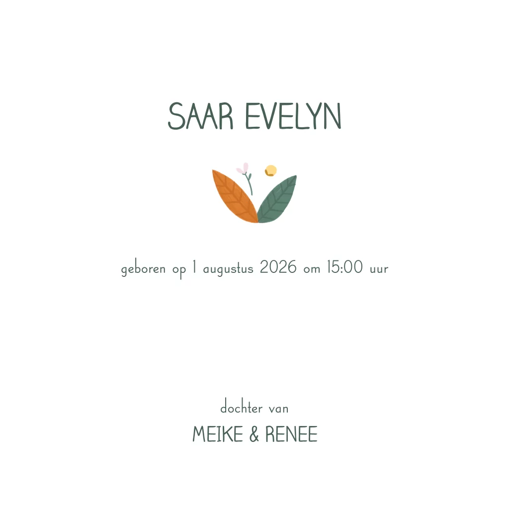 Een lief en vrolijke geboortekaartje met een krans van bloemen en plantjes, waaraan een klein mandje met baby op een schommal hangt.