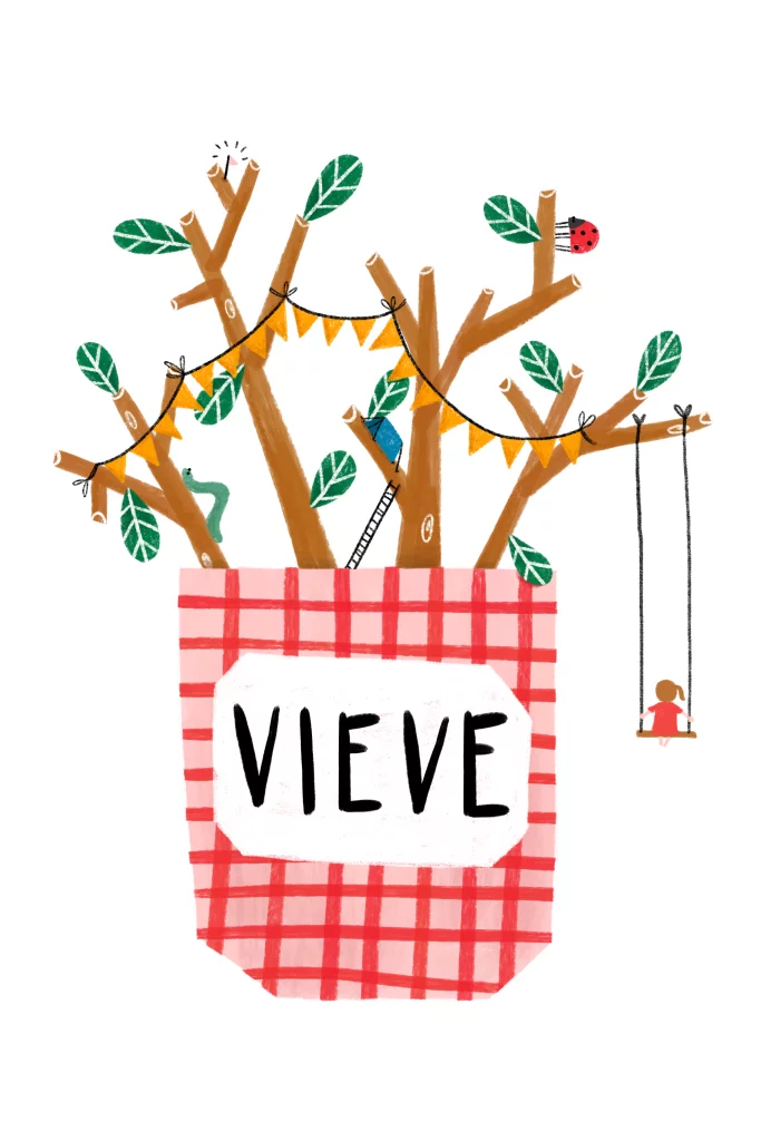 Een schattig vrolijk geboortekaartje met een bloempot met een plantje vol slingers en een mini meisje op een schommel. Pas zelf de haarkleur, huidskleur en kleur van de jurk aan door op de elementjes te klikken.