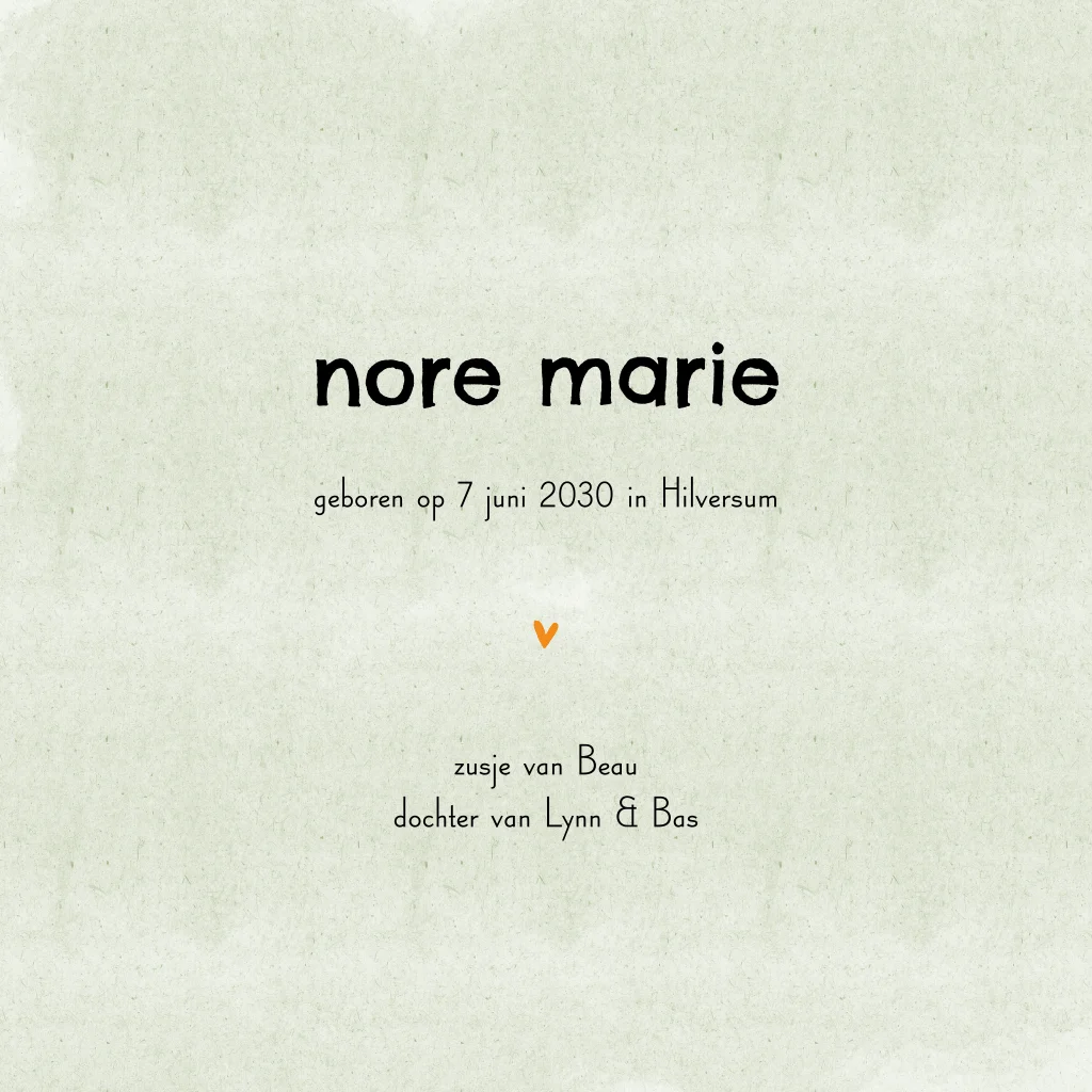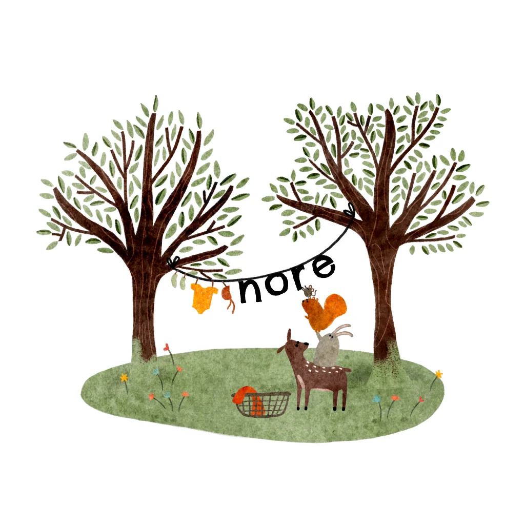 Een super vrolijk geboortekaartje met twee bomen in een veldje met bloemen en een paar bosdiertjes die de was ophangen, waaronder de naam van jullie kindje.