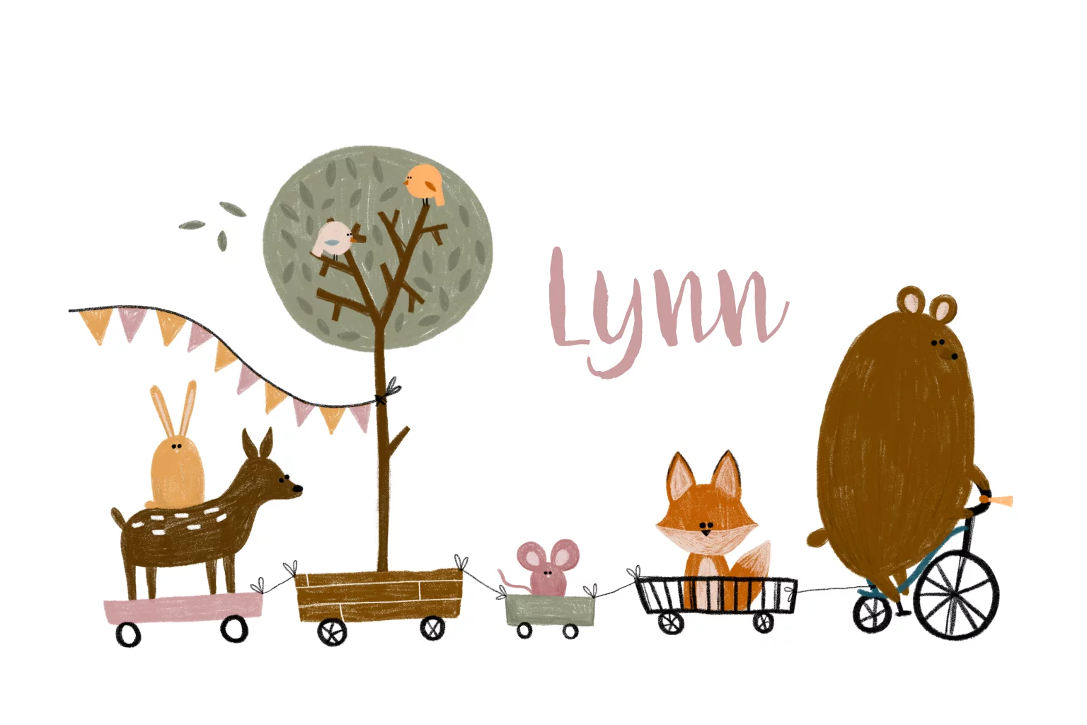 Een vrolijk geboortekaartje met een treintje met verschillende bosdieren, in zachte warme kleuren, in roze en geel.