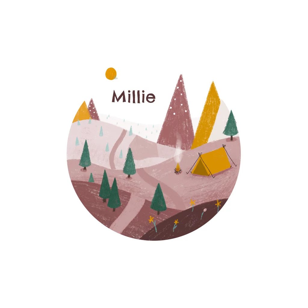 Een bijzonder roze geboortekaartje vol avontuur, met een ronde illustratie van bergen, bomen en een knus tentje.