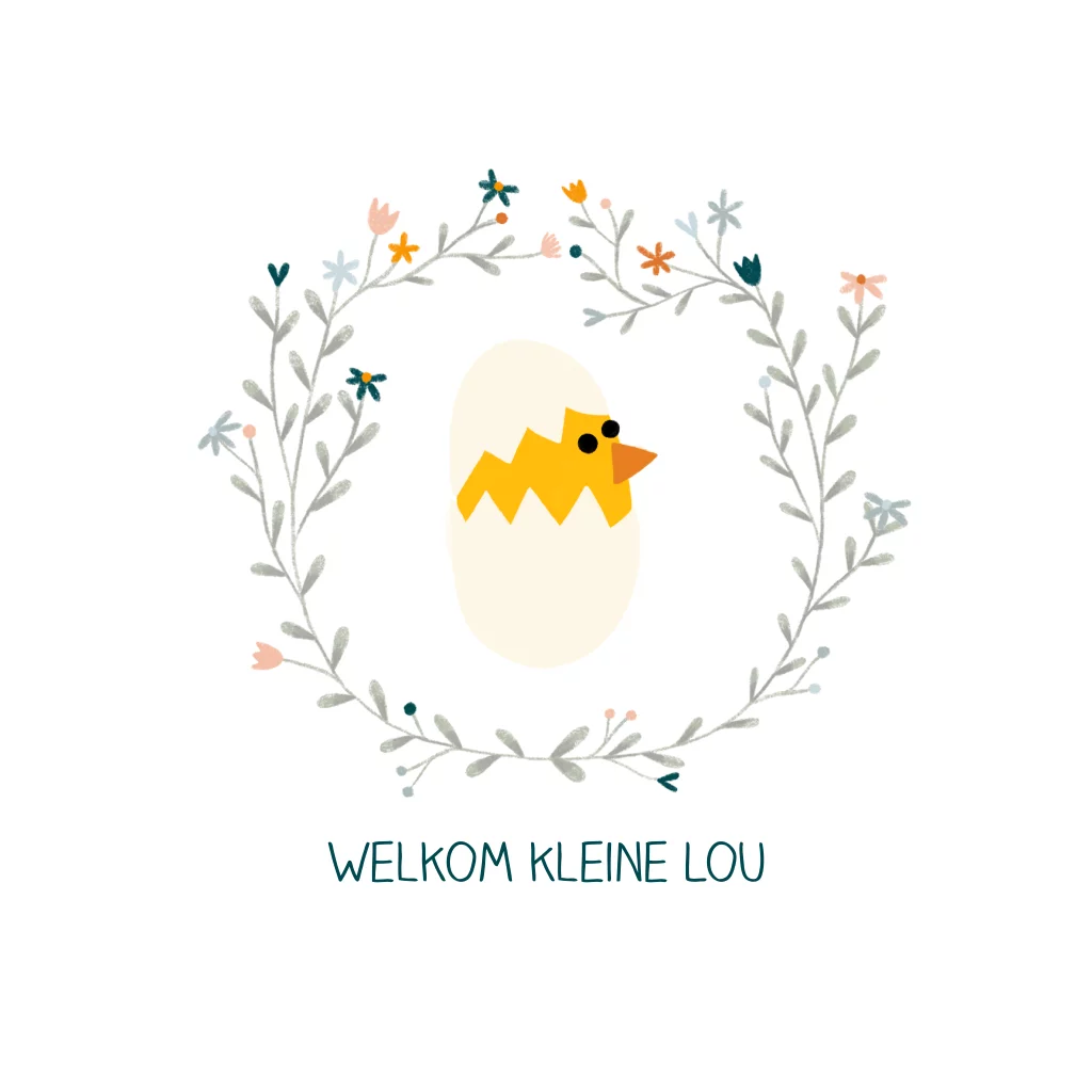 Een geboortekaartje voor een lente kindje met een kuikentje in een vrolijke bloemenkrans.