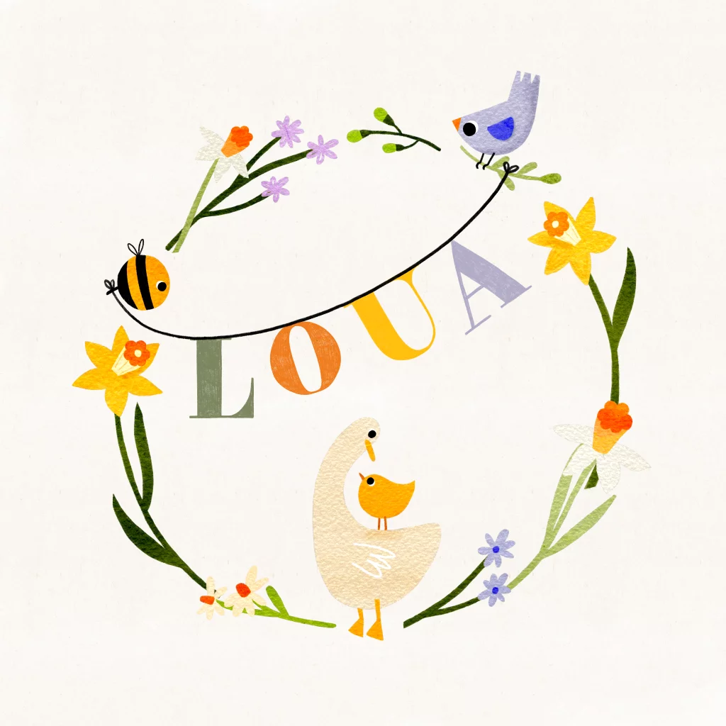 Een lief vrolijk geboortekaartje met illustratie van een lente krans met bloemen, narcissen en schattige diertjes. Met een lieve gans die kijkt naar een kuikentje en vrolijke naamslinger.