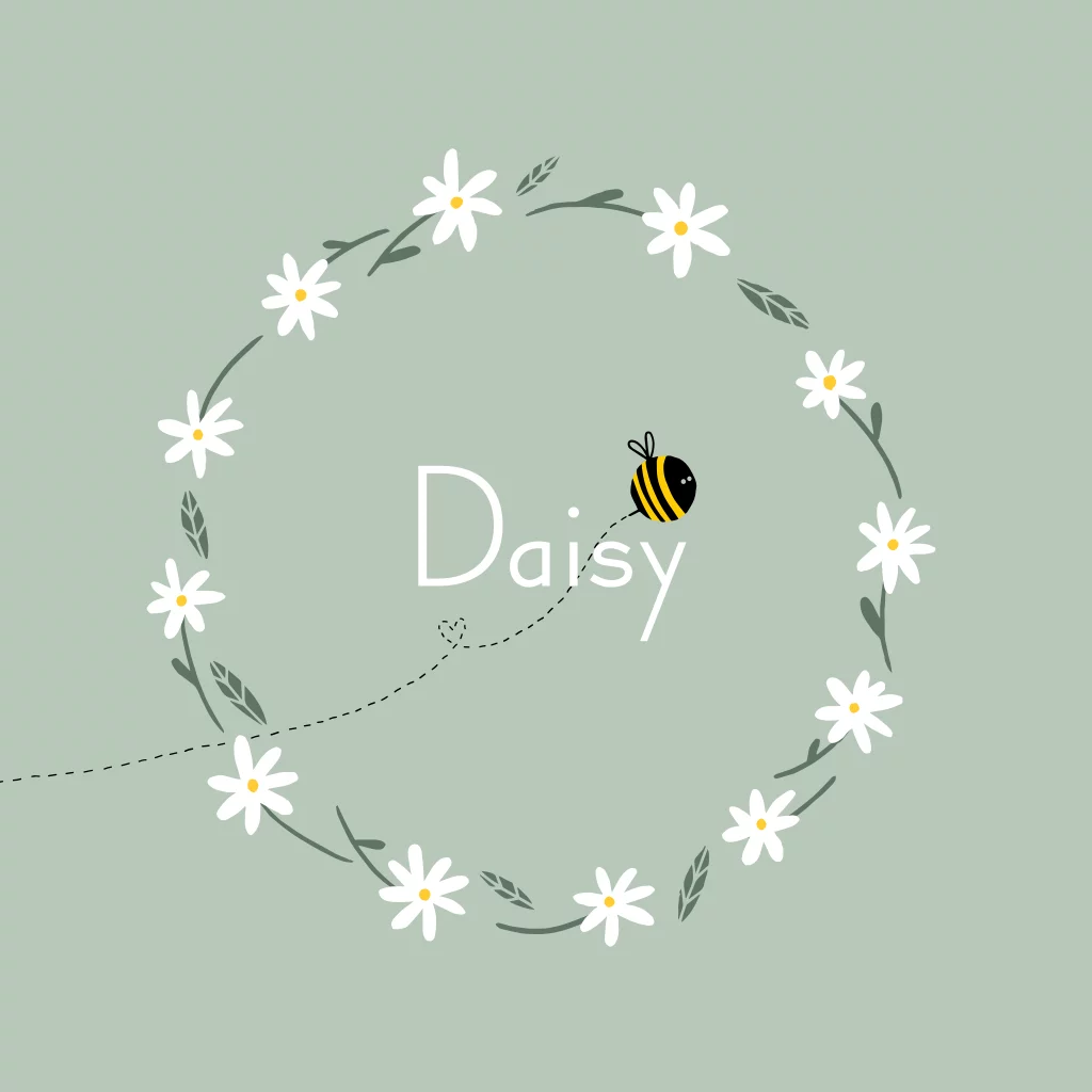 Een lief geboortekaartje met ronde hoeken (kan ik ook voor je omzetten naar rechte hoeken), met een krans van madeliefjes en een bijtje.