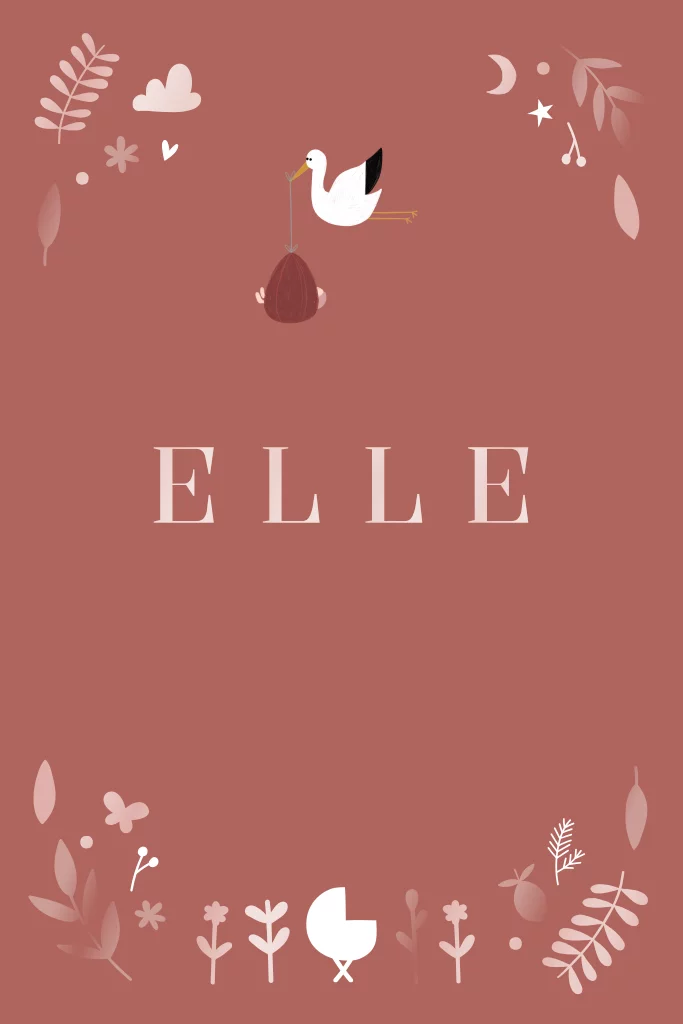 Een schattig lief roze geboortekaartje met vintage look met een ooievaar met draagzakje met baby en verder veel bloemen, planten en takjes in hoogglans kleuren. Pas zelf de kleuren naar wens aan.