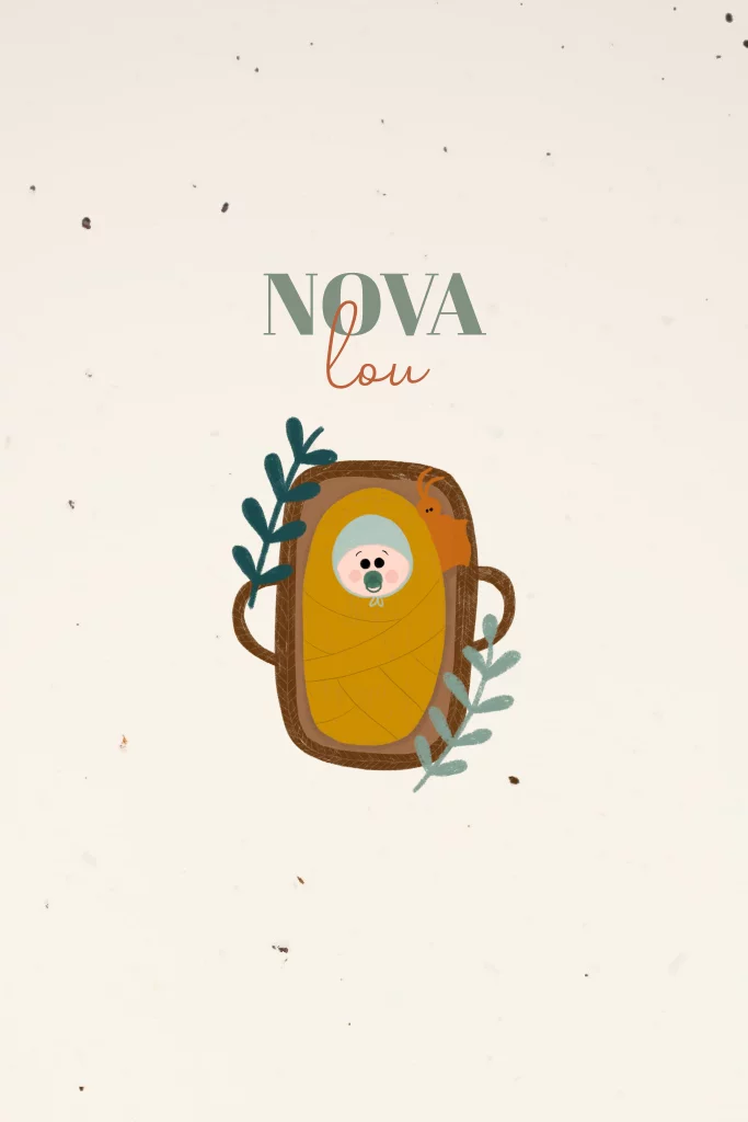 Een schattig minimalistisch kaartje met een mozesmandje en takjes. Dit kaartje is heel erg geschikt voor het drukken op duurzaam papier, omdat er weinig inkt gebruikt wordt en contrasterende donkere kleuren. De achtergrond is een voorbeeld, bestel een proefdruk zodat je duidelijk kunt zien hoe de het kaartje gaat worden! Let op: er kan geen wit gedrukt worden op duurzaam papier.