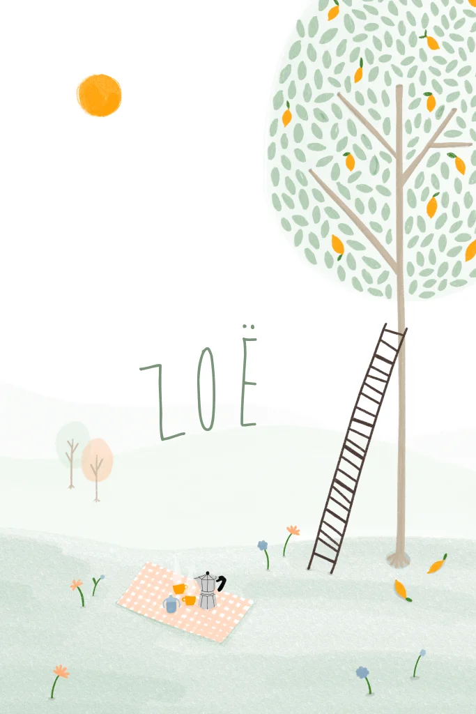 Een zomers geboortekaartje met een gezellige picknick onder een citroenboom met een kopje koffie en een kinder drinkbekertje.