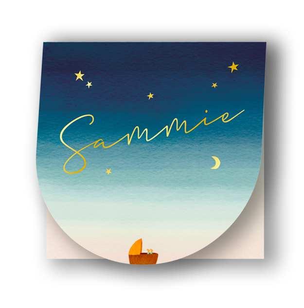 Dit schattige geboortekaartje voor een jongen of meisje met ronde onderkant en rechthoekige achterkant wordt op 11x11 cm gedrukt. Op de voorkant zie je een prachtige sterrenhemel met waterverf verloop van de zon die net is ondergegaan. Aan de binnenzijde heb je veel ruimte voor informatie.