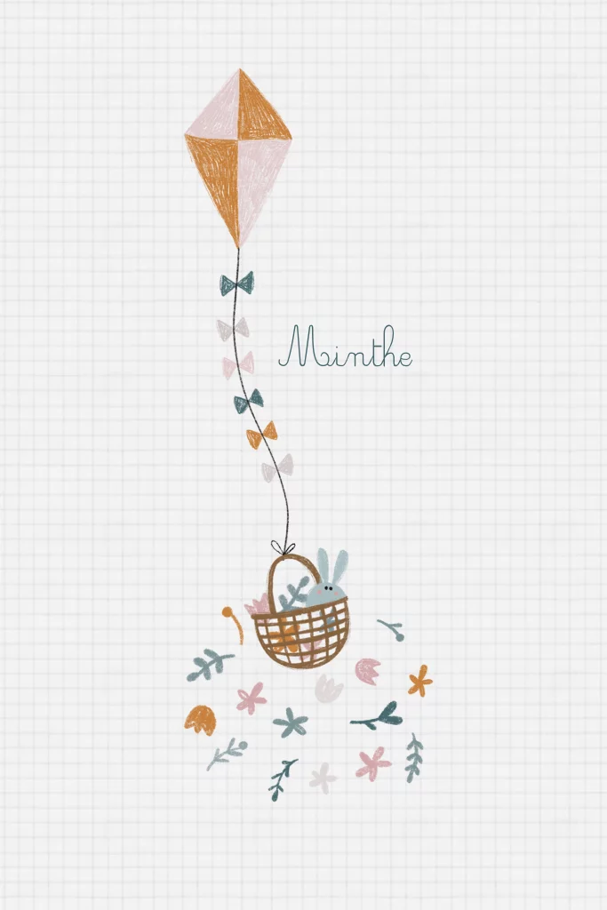 Een hip geboortekaartje met konijntje in een mandje aan een vlieger. De achtergrond kun je ook lichter maken, als je een subtieler ruitje wilt.