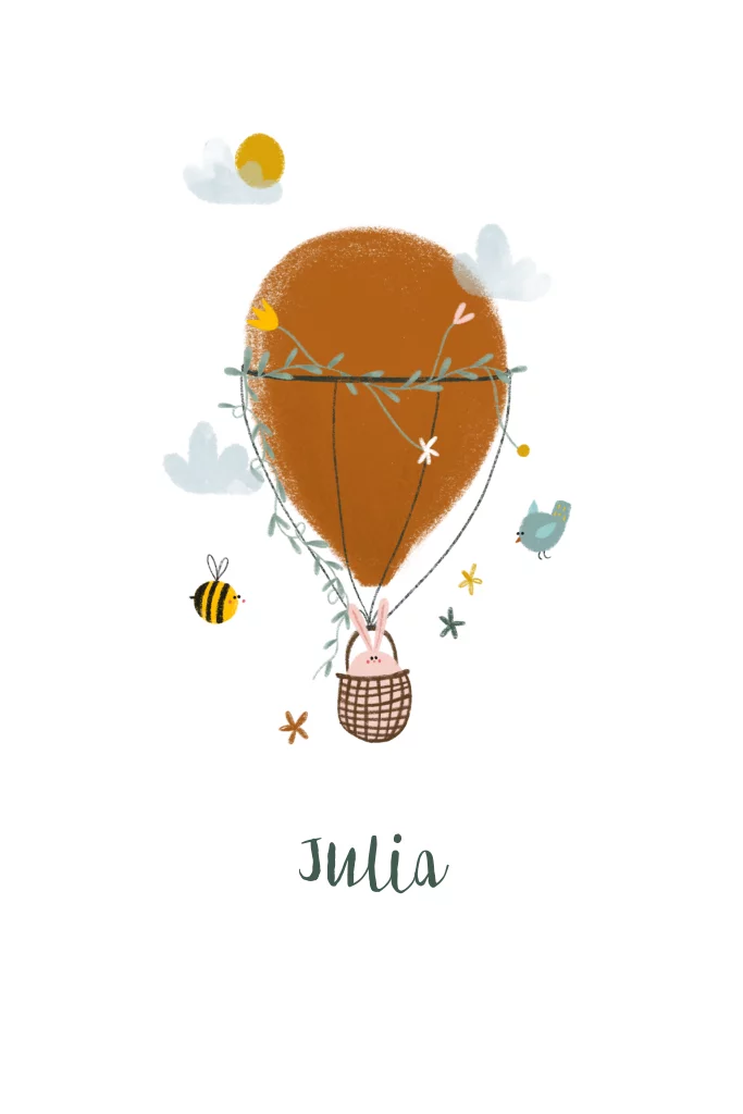 Een lief zomers geboortekaartje met diertjes en een gezellige luchtballon. Combineer met een mooie envelop voor een mooi pakketje!