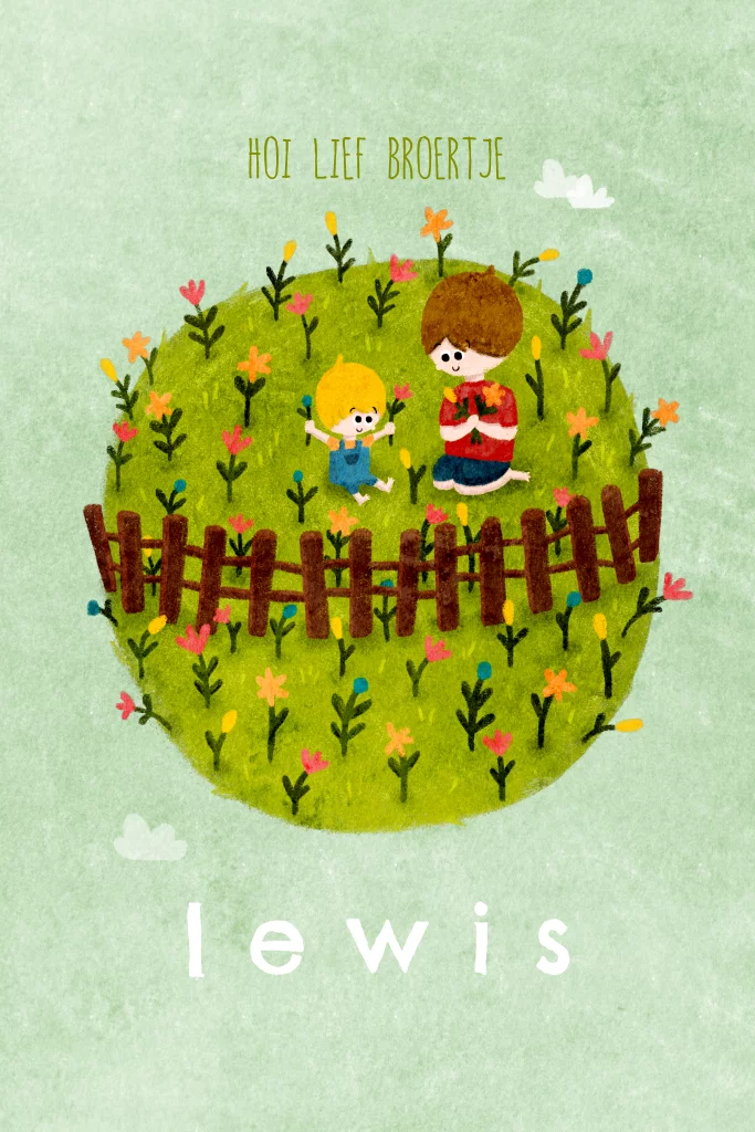 Een vrolijk geïllustreerd geboortekaartje met een illustratie van een grote broer die bloemen plukt met zijn kleine broertje. Wil je liever een grote zus of klein zusje? Of een andere haar/huidskleur? Laat het even weten, ik pas het kosteloos voor je aan!