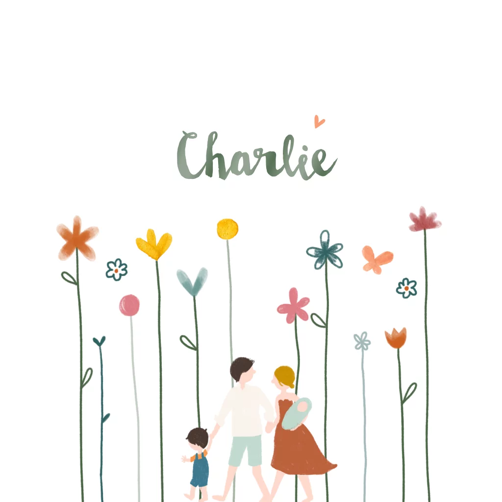Een zomerse lieve unieke geboortekaart met een illustratie van een gezin wat door een bos van bloemen wandelt. Pas zelf alle kleuren van het gezin naar wens aan. Wil je het geslacht/kapsel aanpassen? Of een extra kindje erbij? Stuur een berichtje en ik pas het kosteloos voor je aan!