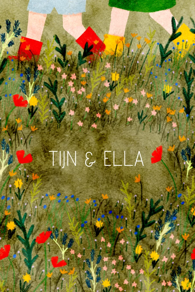 Een avontuurlijk lief geboortekaartje voor een tweeling broer en zus, boordevol gezellige veldbloemen zoals klaprozen. Bovenin zie je de beentjes van broer en zus, die met hun laarsjes door het veld op avontuur gaan. Wil je bijvoorbeeld een andere huidkleur? Stuur een berichtje, ik pas het heel eenvoudig voor je aan!