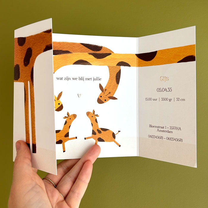 Een lief en uniek geboortekaartje met giraffen in een bijzondere theatervouw. De lange nekken van papa en mama giraf lopen speels door van de buitenkant naar binnen, waar ze hun tweeling liefdevol bekijken. De matte goudfolie maakt dit bijzondere kaartje helemaal af. Dit unisex geboortekaartje met diertjes is perfect voor jongens en meisjes.