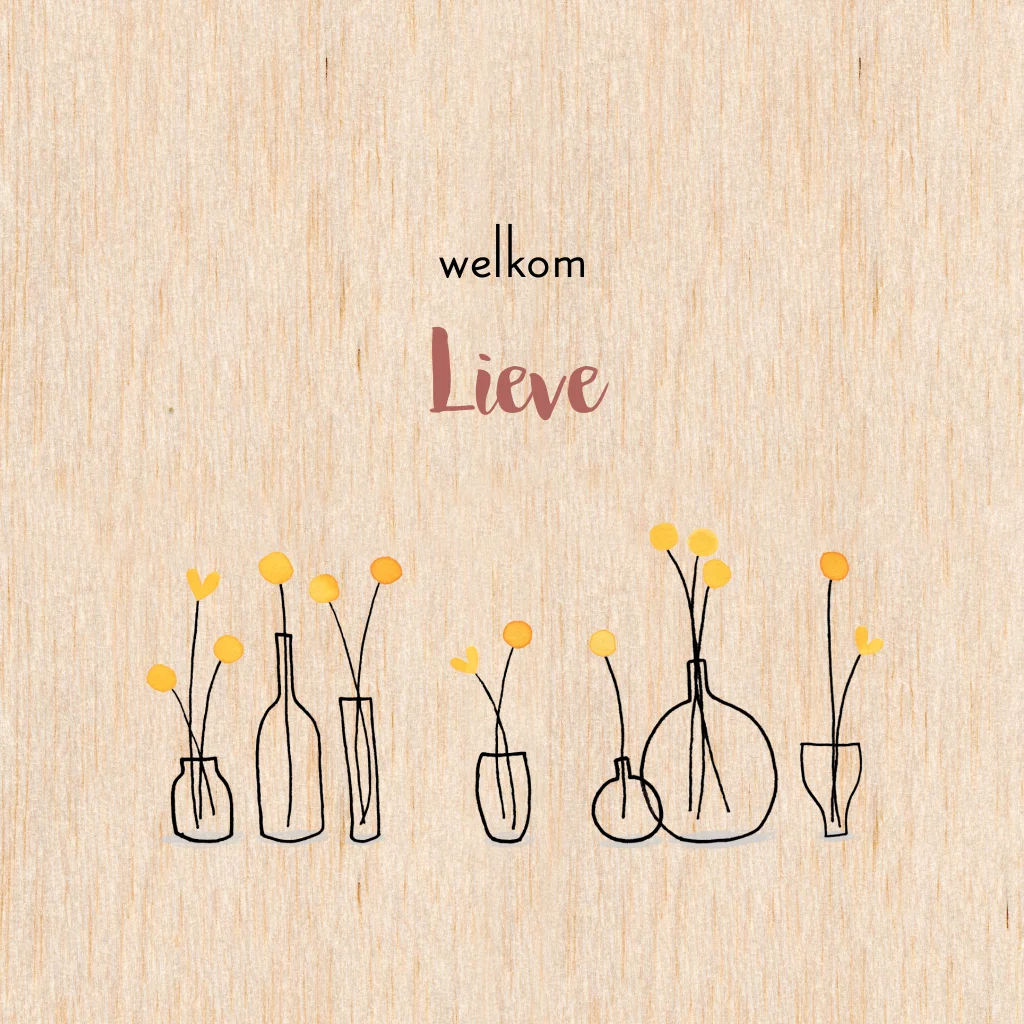 Een rustig geboortekaartje gedrukt op echt hout, met bloemetjes in vaasjes.