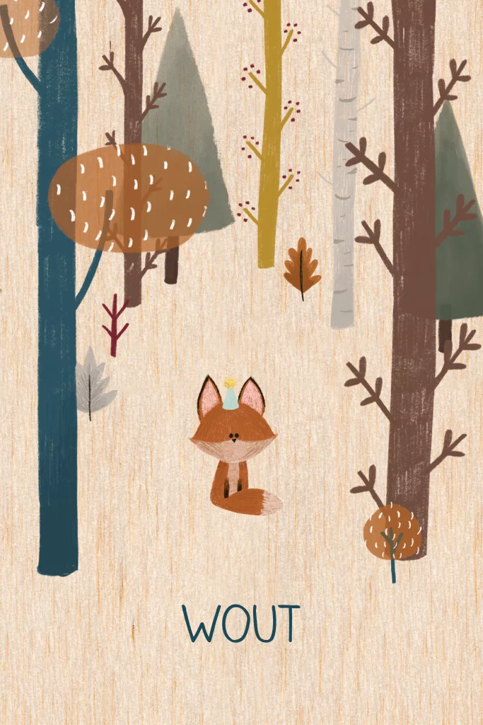 Een geboortekaartje gedrukt op echt hout, met een bos en een vosje. Je kunt ook een eekhoorntje of hertje op de plek van het vosje plaatsen.