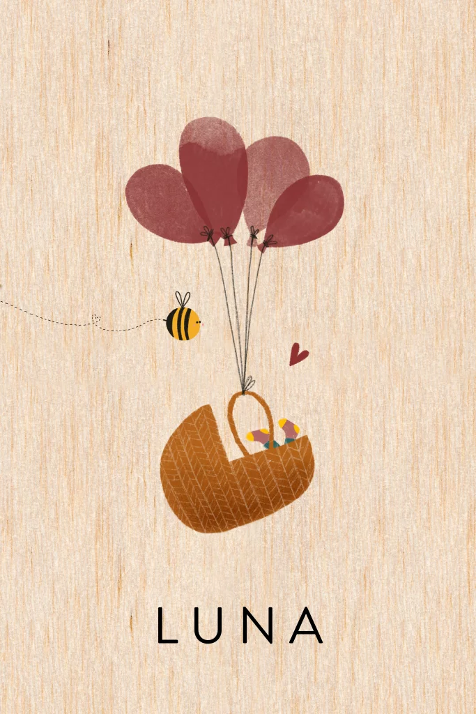 Een lief feestelijk geboortekaartje met een mandje en ballonnen, gedrukt op 1 mm dik berkenhout. Goed om te weten: • Elk kaartje is verschillend omdat hout een natuurlijk product is. • Minimum oplage is 20 stuks. • Deze kaart heeft een langere verzendtijd: voor 17.00 uur besteld = de volgende werkdag gedrukt en verzonden. • Het is technisch niet mogelijk om wit te drukken, gebruik dus geen wit. • Dit formaat houten kaartje heeft meestal 1 postzegel nodig, maar weeg jouw pakketje zelf na! Voor verdere vragen: stuur me even een berichtje!